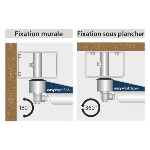 Sa conception lui permet d'être installé soit contre un mur pour une rotation de 180° soit sous un plancher pour une rotation complète de 360°