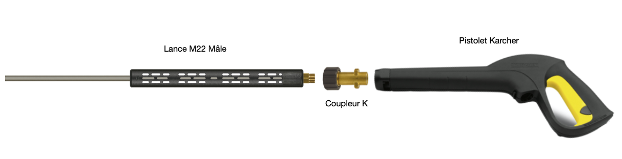 Peut être utilisé pour raccorder des accessoires comme des lances, des flexible de débouchage canalisation, un canon à mousse etc ... avec un filetage M22.M (comme sur notre photo d'illustration)