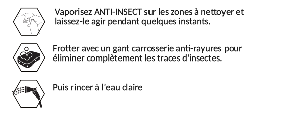 ATTENTION : par temps chaud, il est conseillé de mouiller d'abord la carrosserie. Ne jamais laisser le produit sécher sur le véhicule. Rincer à l'eau claire